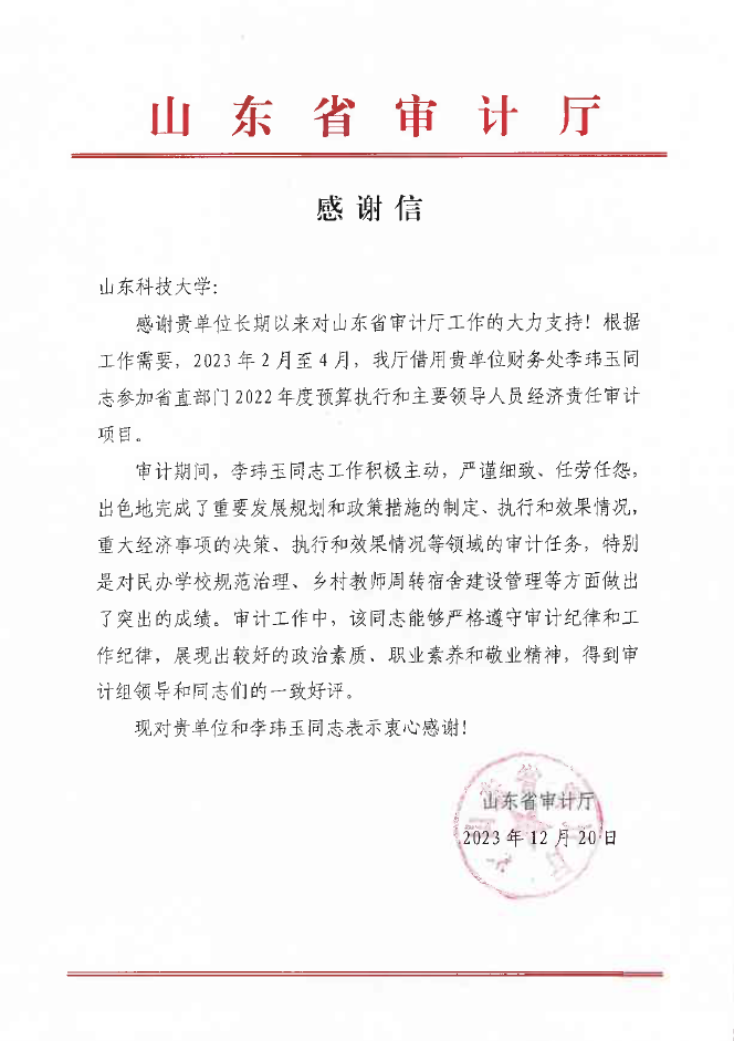 2023年,濟(jì)南校區(qū)財務(wù)部李瑋玉同志參加了山東省審計廳相關(guān)審計檢查專項活動并圓滿完成任務(wù),上級部門對其突出表現(xiàn)給予了高度評價,并給我校發(fā)來感謝信,表示對她工作的認(rèn)可和贊揚。