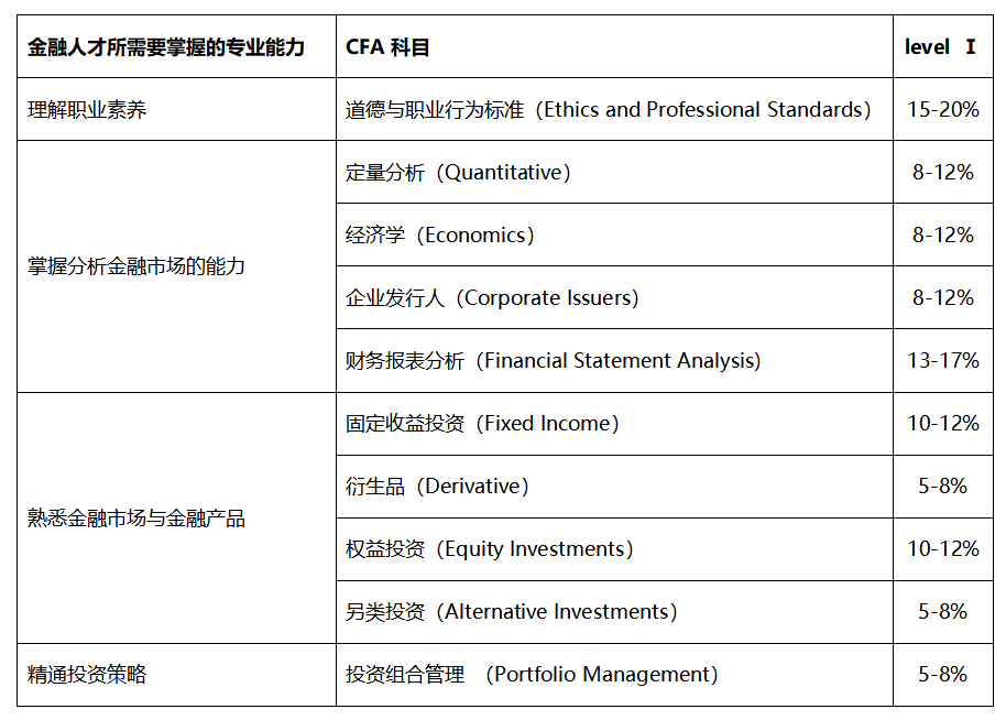 CFA的學(xué)習(xí)內(nèi)容可分為4個(gè)模塊、10個(gè)科目: